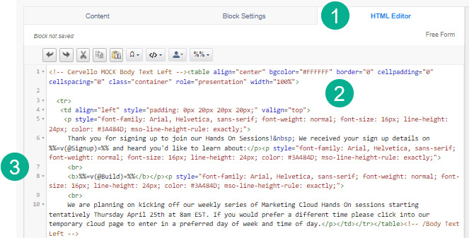 (2) You can play and learn all the fun and cool aspects of HTML right here in Marketing Cloud and see how it impacts your content. For example in this Table tag that begins on line 1 “<table” You can change the bgcolor to a different hex number which will change the background of the block simply by pasting in a different hex number.