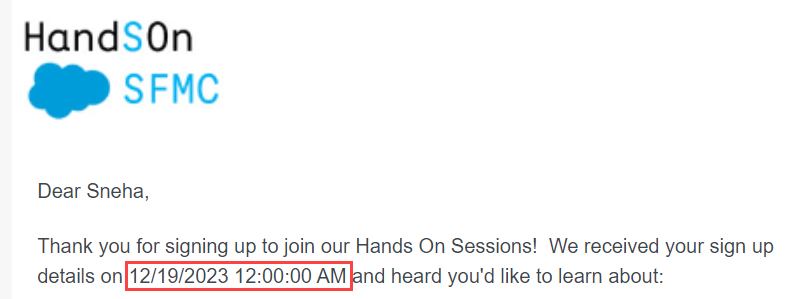 EMPTY is helpful when checking to see if a value is null. But what if you need to customize your content depending on the value of the data? Let’s use the email we use to welcome new signups to our hands on session. On our signup form we ask what you would be interested in building.