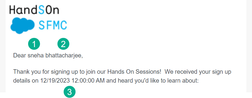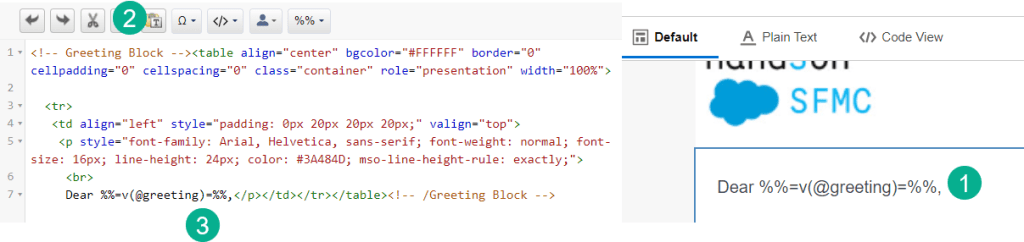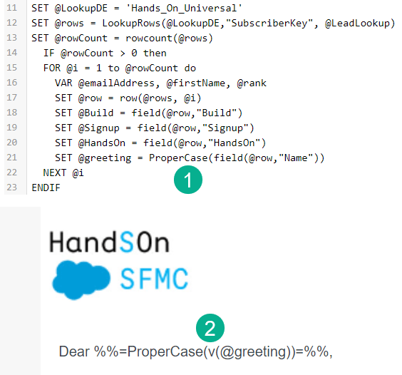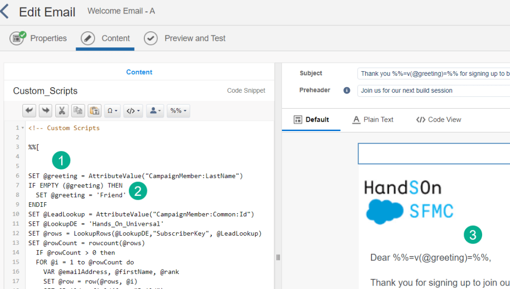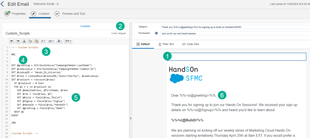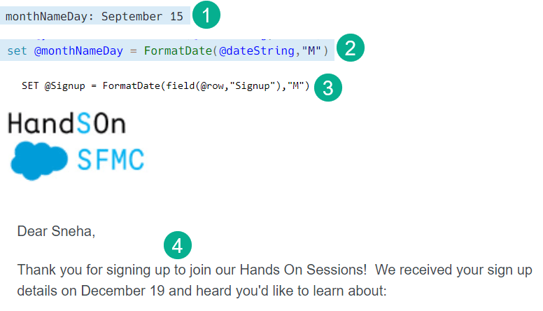 (4) That way for each email all you need to replace is the value in quotes which typically will be the data extension field that has the greeting name.