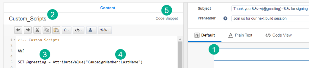 In our example below we create a variable for our greeting. Now we could simply output inline that variable like Dear %%CampaignMember:Common:LastName%% and not have to add any more coding. This is totally fine if your personalization is basic. Use variables to add another level of functionality to your personalization.