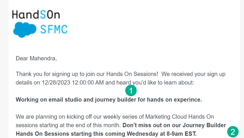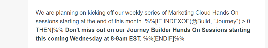 %%[IF INDEXOF(@Build, “Journey”) > 0 THEN]%% Don’t miss out on our Journey Builder Hands On Sessions starting this coming Wednesday at 8-9am EST.