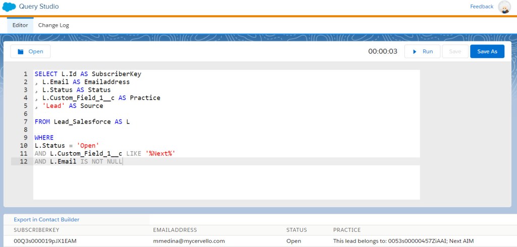 In this session the team reviews the building out of a Query and finalizes the Lead query populating data in a data extension. Later on in the session the team utilizes the Query Studio app and makes some on the fly code updates to handle null values in the data.