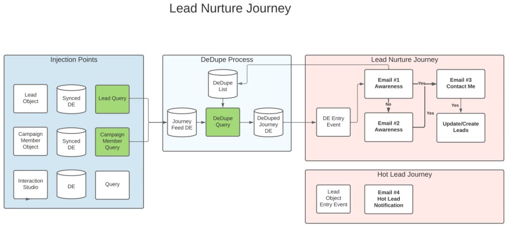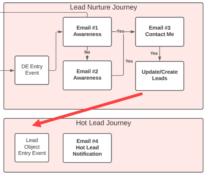 This will be our second journey build that will send a hot lead notification to the owner or the lead or contact when the subscriber is ready to talk. This will involve activities in the Lead Nurture Journey to create and update objects in Salesforce which will kick off the Hot Lead Journey.