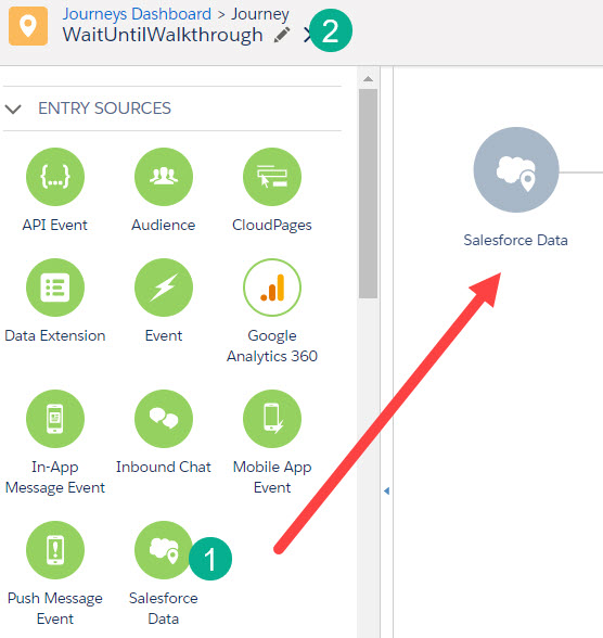 Create a new multi-step Journey. Select (1) Salesforce Data entry source and drag it to the Entry Source section of your Journey canvas.