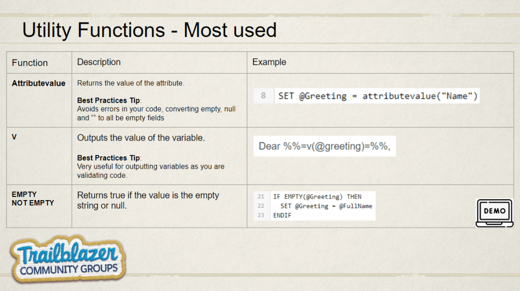 Let’s walk though the core Utility functions used often in ampscript: attributevalue, v and Empty.