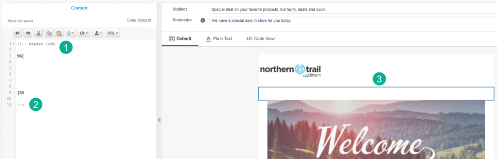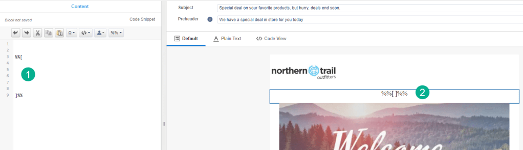 One side effect to coding this way is that the ampscript will render in the email canvase (2) which can look a little offputting to the user. This code won’t render when the email is sent, but still can look messy.