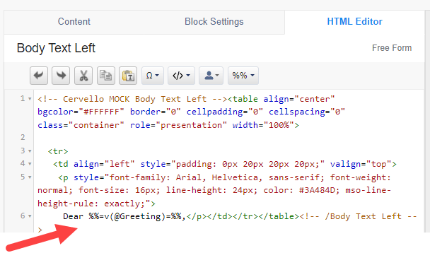 We’ll swap out “Friend” in the code and replace it with the standard v function syntax referencing the new variable we just created %%=v(@greeting)=%%.