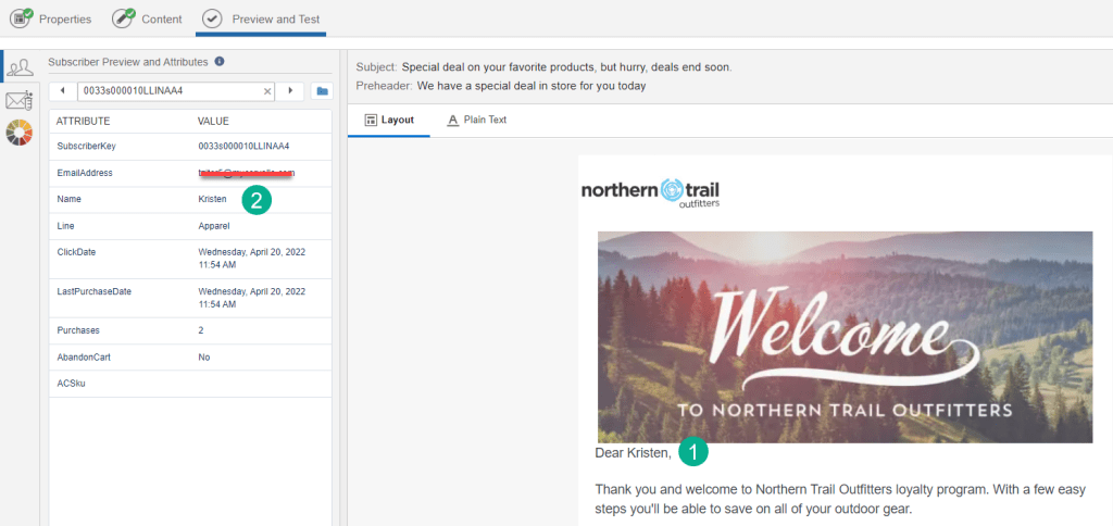 With our new code in place and previewing the email against the send data extension we now have a first name as part of our greeting (1).