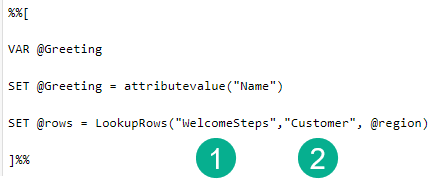 (1) Using the same syntax that we covered in our attribute value session we set the SubID variable to the field in the data extension that contains the SubscriberKey.