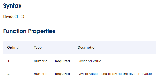 Let’s take a look at the documentation that Salesforce provides on the Divide and FormatCurrency function.