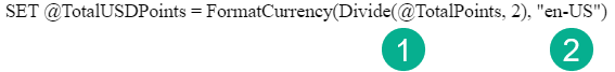 Note: If you want to add additional decimal places use the third field. If not selected it will default to the culture code. If you want a different currency symbol as well add field four otherwise the default will render. For example in english 2.1345 would return as $2.13