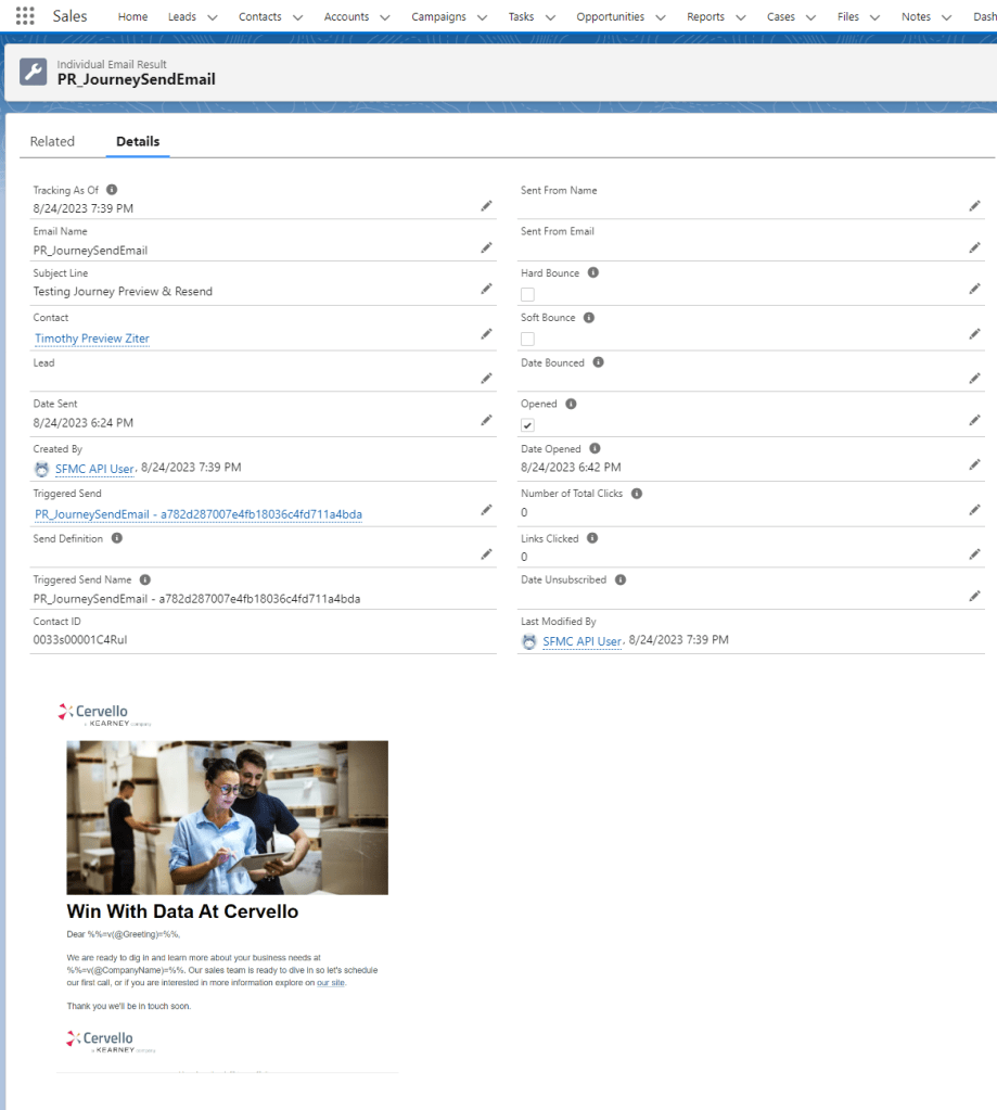What they will see in the Individual Email Results object is less than optimal. (1) The email which appears in the thumbnail at the bottom of the screen may or may not be there and can be very small. And (2) The email won’t display the “send-time” personalization, it will display the ampscript code only. That is because Sales Cloud is only able to display the basic email template.