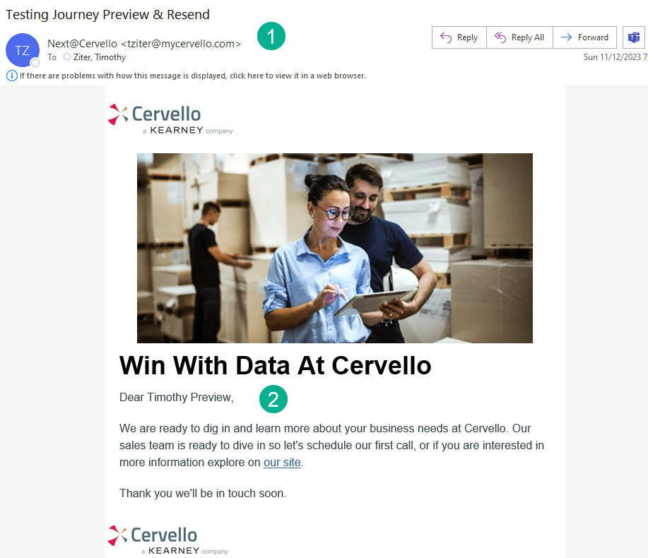 In this use case we are using simple personalization variables of greeting and company name. If the email is highly personalized, the entire email could be in ampscript code, making the previewing of the email sent to the contact relatively useless.
