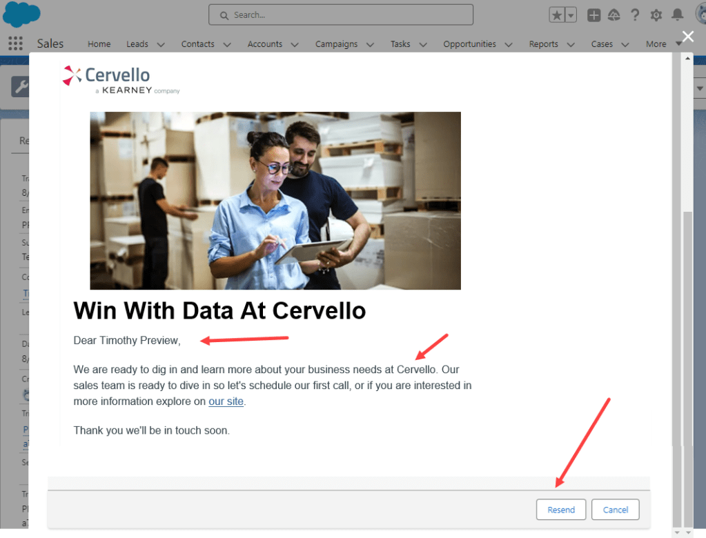 With Preview-Resend enabled sales can preview and resend and email in two easy steps.
