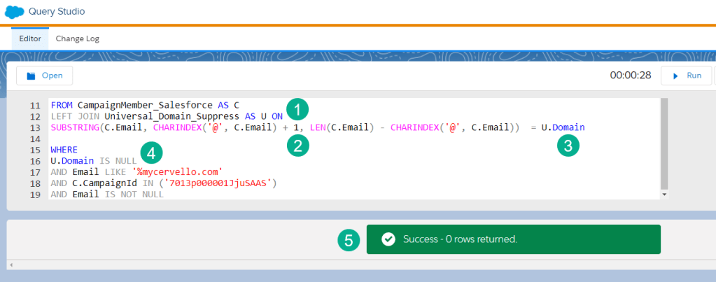 (3) To output all records that contain the mycervello.com domain we are using the LIKE function. We’ve added a query cheat sheet that breaks down the variations in syntax for the LIKE function here:https://handsonsfmc.com/query-cheat-sheet/
