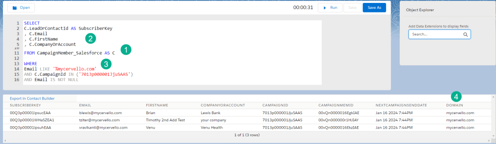 (4) And when running the data extension in Query studio we can validate there are three emails with the mycervello.com email domain.