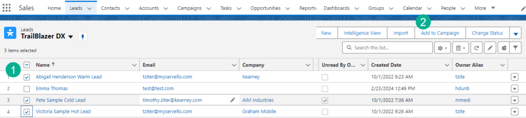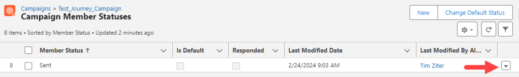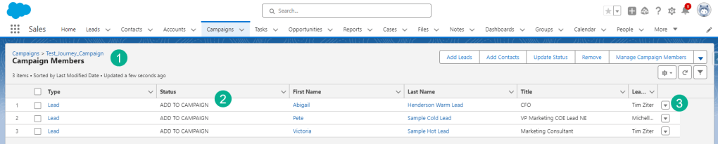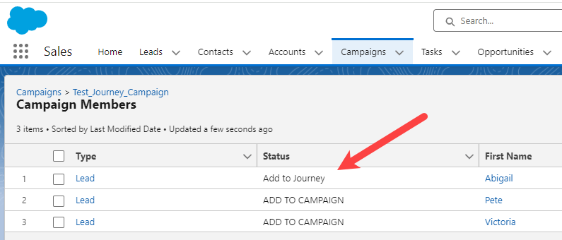 3.) Update a campaign member status to enter them into the Journey. Navigate back to Sales Cloud. Select a campaign member and change their status to “Add to Journey”.