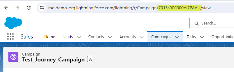 (2) In the WHERE clause we’ll want to select only those who are in the campaign we created. To find that campaign ID navigate to the campaign in Sales Cloud and pull the id from the URL.