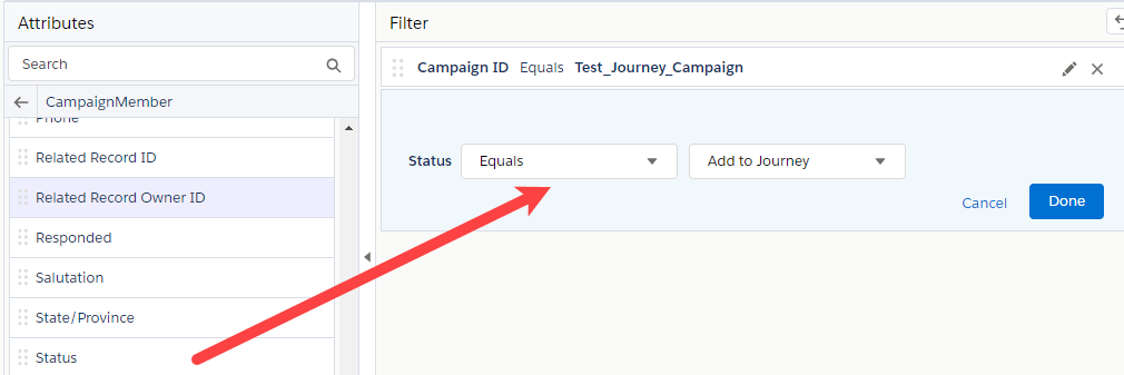 Add Status equals “Add to Journey” and you’ll be done with the Entry Criteria: