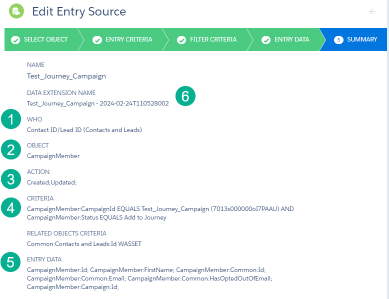 (6) DATA EXTENSION NAME – journey builder will create a data extension for you and here’s the name. Typically it’s created in the default Data Extension folder.