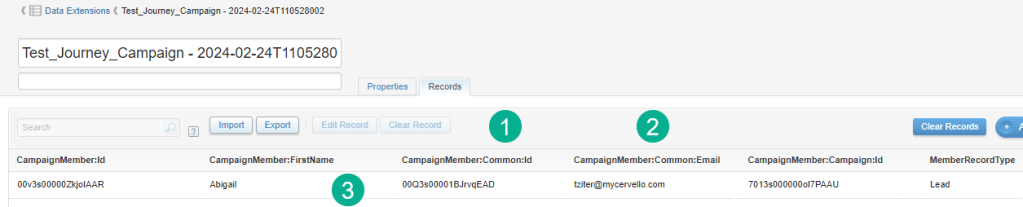 4.) Validate the data in the Journey Data Extension. Navigate to the general data extension folder in Marketing Cloud and click into the Records tab to view the data: