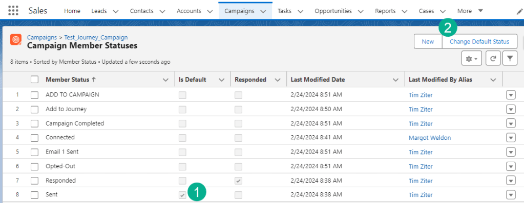 (2) Note the Default status which will automatically be added to any new campaign member when added.