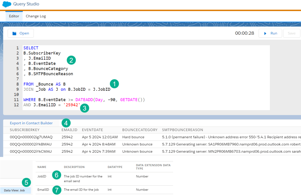 We’ll be utilizing the bounce dataview for this query. We recommend two different resources that breakdown Marketing Cloud data views:
