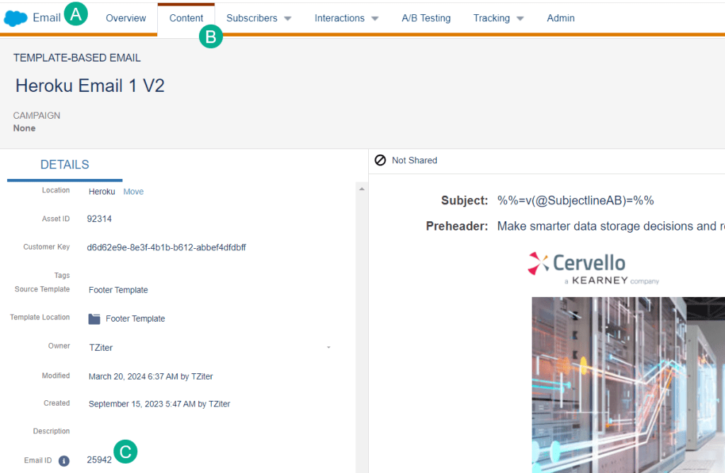(C) Before you click in and edit the email the properties tab will appear and on the left you’ll find the EmailID, a unique ID for each content piece.