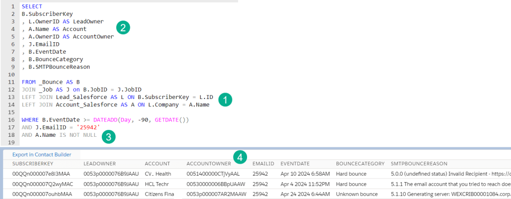 (1) We are joining the Lead and Account synchronized data extensions to pull in Lead and Account fields. Like the above query we are finding those data points that exist in both data sets that will allow us to JOIN them to the data Job/Bounce data sets. We are using LEFT JOINs in case the bounce records aren’t leads or don’t have an associated account. For more on how to set up synchronized data extensions please click here: https://handsonsfmc.com/how-to-create-a-synchronized-data-extension-in-marketing-cloud/