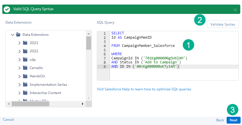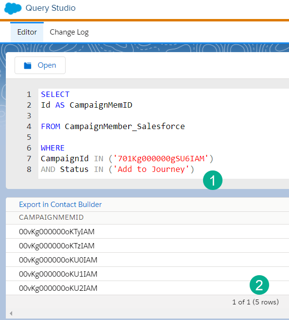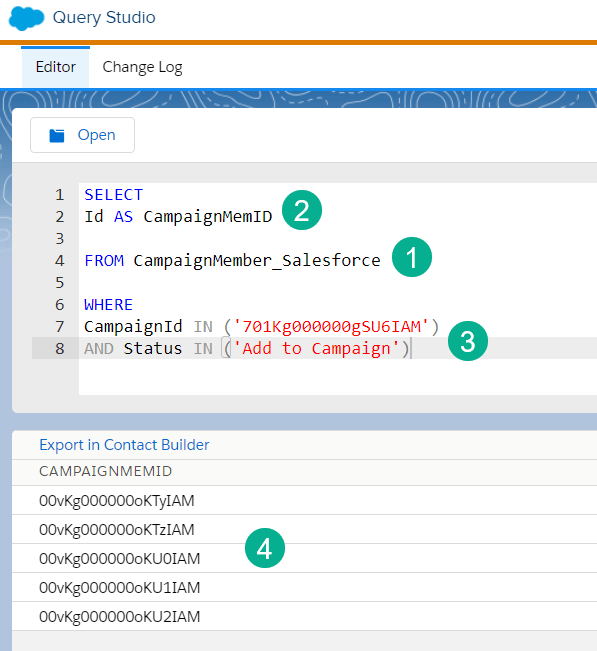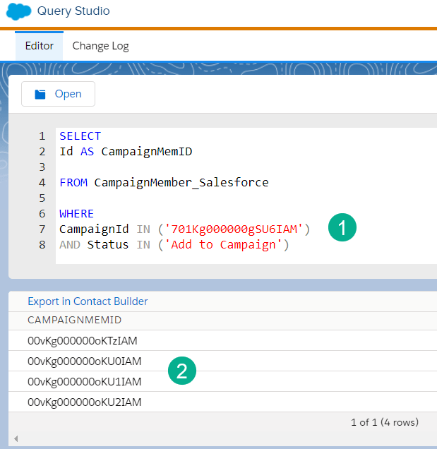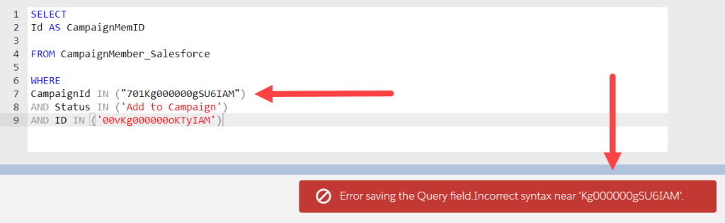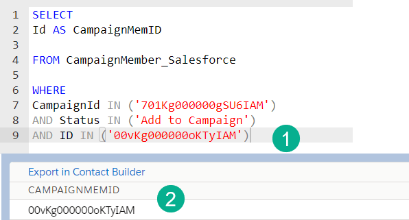 (2) The only output or field we’ll need in our SELECT statement will be the campaign member ID, which identifies the records we need to update in Salesforce.