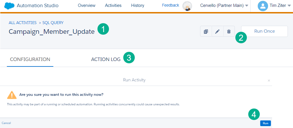 (3) Unlike the automation you’ll not be able to see the running of the query in progress. Checking the Action Log shortly after you click Run Once will help solve any errors that might arise.