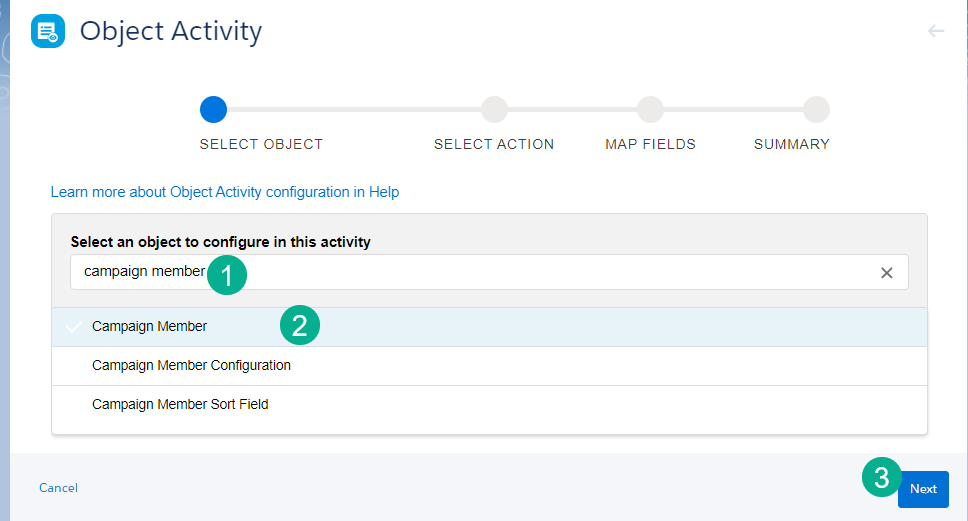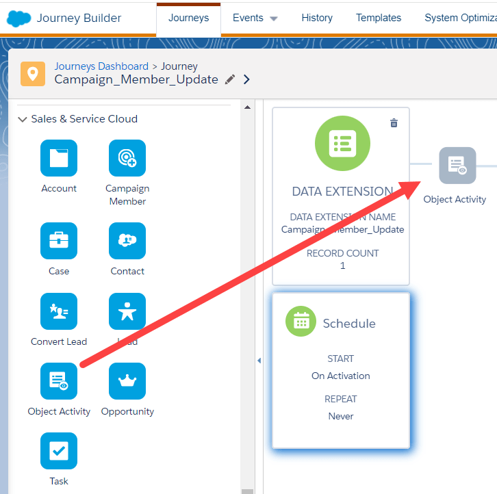Add an “Object Activity” activity from the Sales and Service Cloud activities to your canvas and click into the activity to begin configuration.