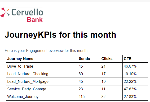 (1) There is limited options to customize the report. You can add Journeys but only by name vs communication or activity.