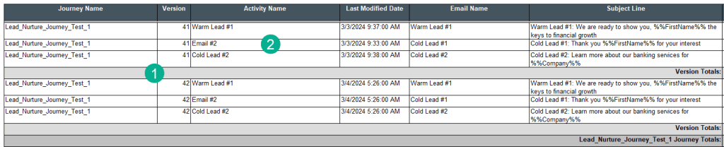 (3) Journey Name, (4) Version Number and (5) Journey Status will be key data fields in the custom reporting.