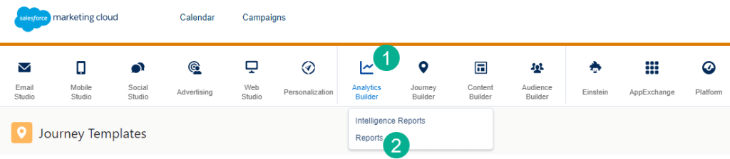 Marketing Cloud has two, but essentially one stock report in the Analytics Builder tab to provide basic engagement reporting. If you are starting out creating journeys this option will be a good choice for you.