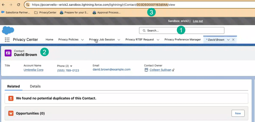 (3) You’ll need the contact ID for David so select the 18 digit Salesforce ID in the URL, the ID begins with 003.
