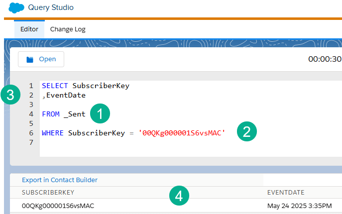 (3) In our SELECT we want to output two fields, the SubscriberKey and the date of the Event. For more on the basics of SELECT in SQL:https://handsonsfmc.com/how-to-sql-marketing-cloud-select/