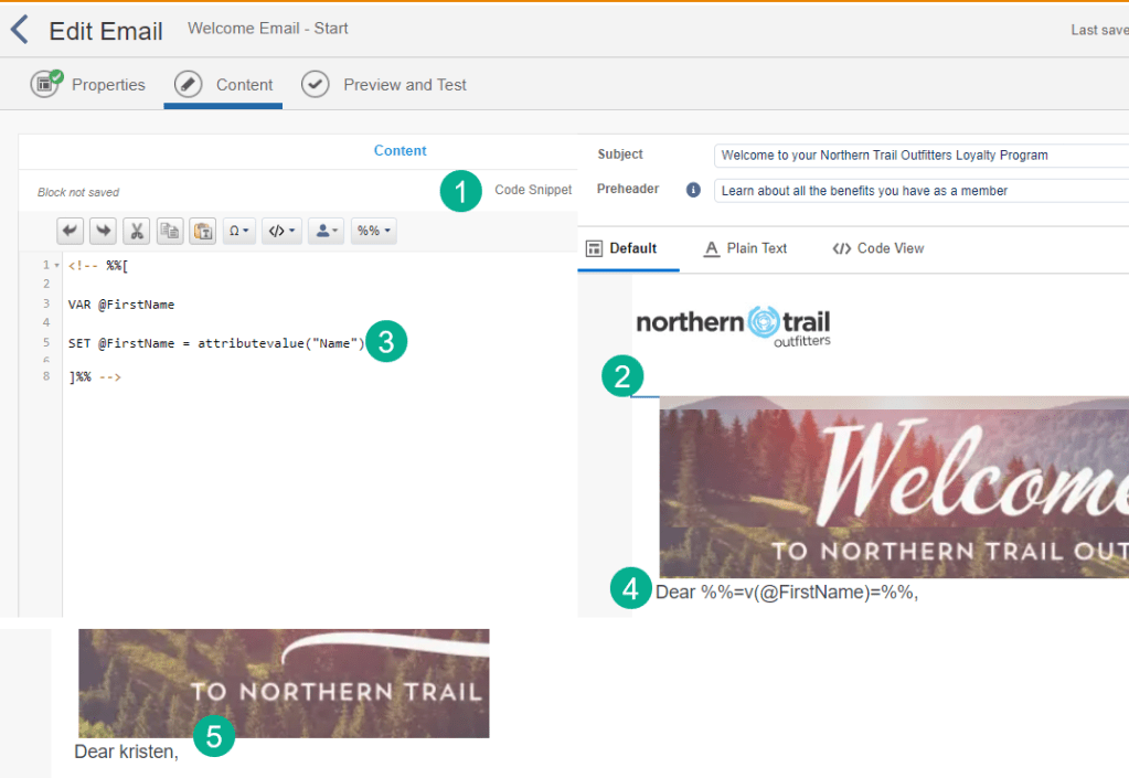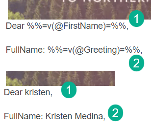 (4) Update the personalization utilizing the “v” function to output the first name variable