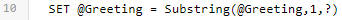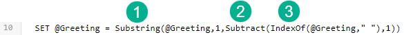 The first value @Greeting has the full name that we want to reduce to the first name. And we want to start value #2 on the first character position. That leaves the last value which we need to figure out.