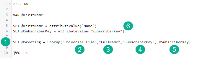(1) Setting the @Greeting variable to return the Full Name from the Universal_File data extension.