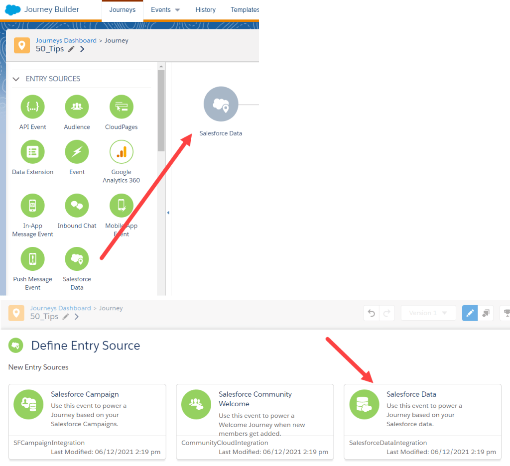 Tip: In the Define Entry Source section of the Entry Event setup always choose the Salesforce Data tile as it will give you the most options.