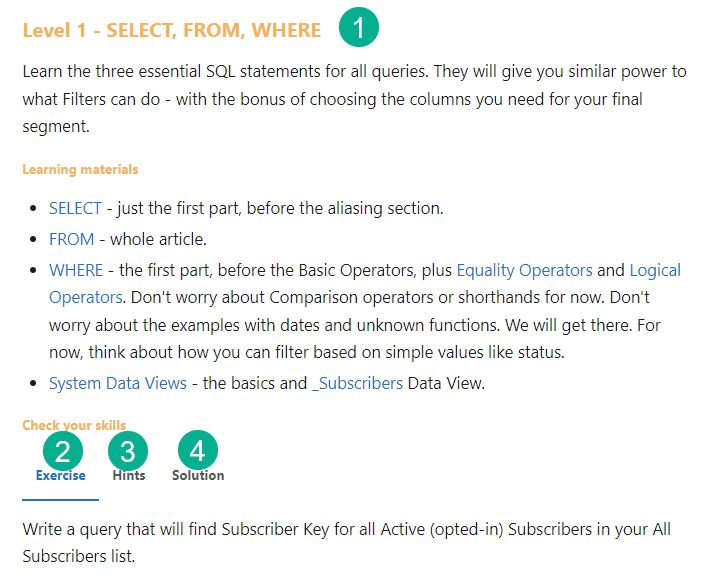 SQL cheat sheets are handy to reference if you need to find the right syntax for say the LIKE function or understand which type of JOIN to use. Here’s out Cheat Sheet and we hope it comes in handy for you: https://handsonsfmc.com/query-cheat-sheet/