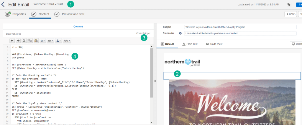 16.) Create a Code Snippet Block at the top of each email to store Ampscript