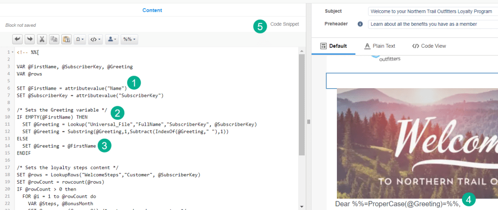 (5) Don’t forget to use a Code Snippet block when storing ampscript.