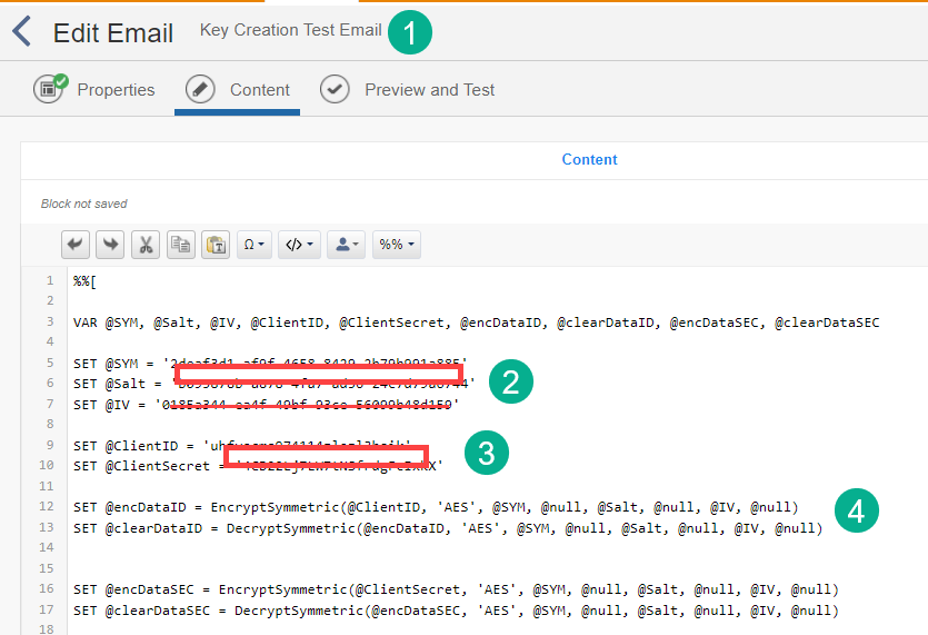 (2) Pass in the encrypted variables created in your Key Creation test email