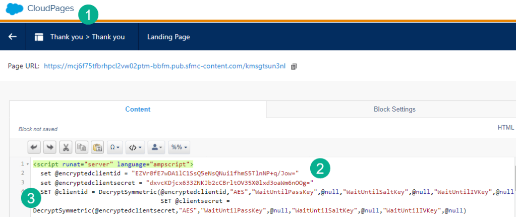 Utilize the keys in Marketing Cloud to encrypt and decrypt credentials to keep cloud pages and other assets secure. We break this process down in detail at the following page:https://handsonsfmc.com/how-to-create-keys-in-marketing-cloud/