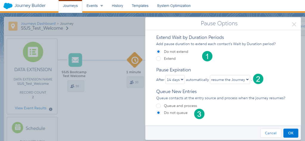 (1) This is a nice feature where it looks like you can pause even those in an existing journey. Now this can be handy if #2 wasn’t so limiting.