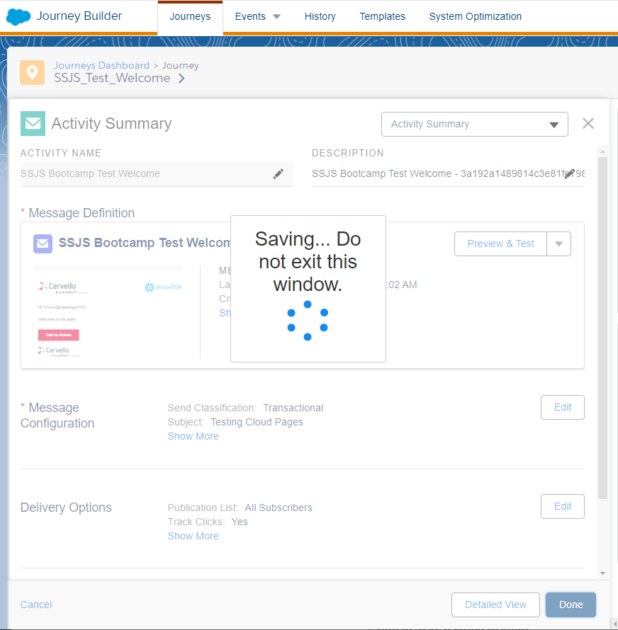Making an update to an email that is in an active journey? Don’t forget to update the email content in the journey as well. The email updates won’t take affect unless you do. Click into each email and select “Done”. If you are updating a version that is active you should see the following spinner which will confirm the email is being updated: