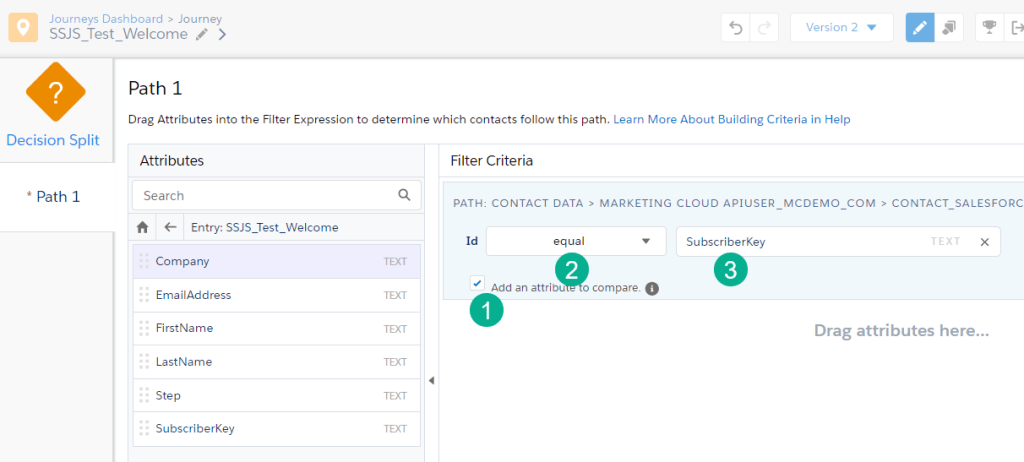 When configuring a decision split in Journey builder if the data point you are using is matching a data point in a synchronized data extension with a 1 to many relationship you’ll want to utilize the attribute to attribute function.