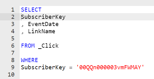 Here’s a basic query accessing the Click data view to check if a certain subscriber has clicked